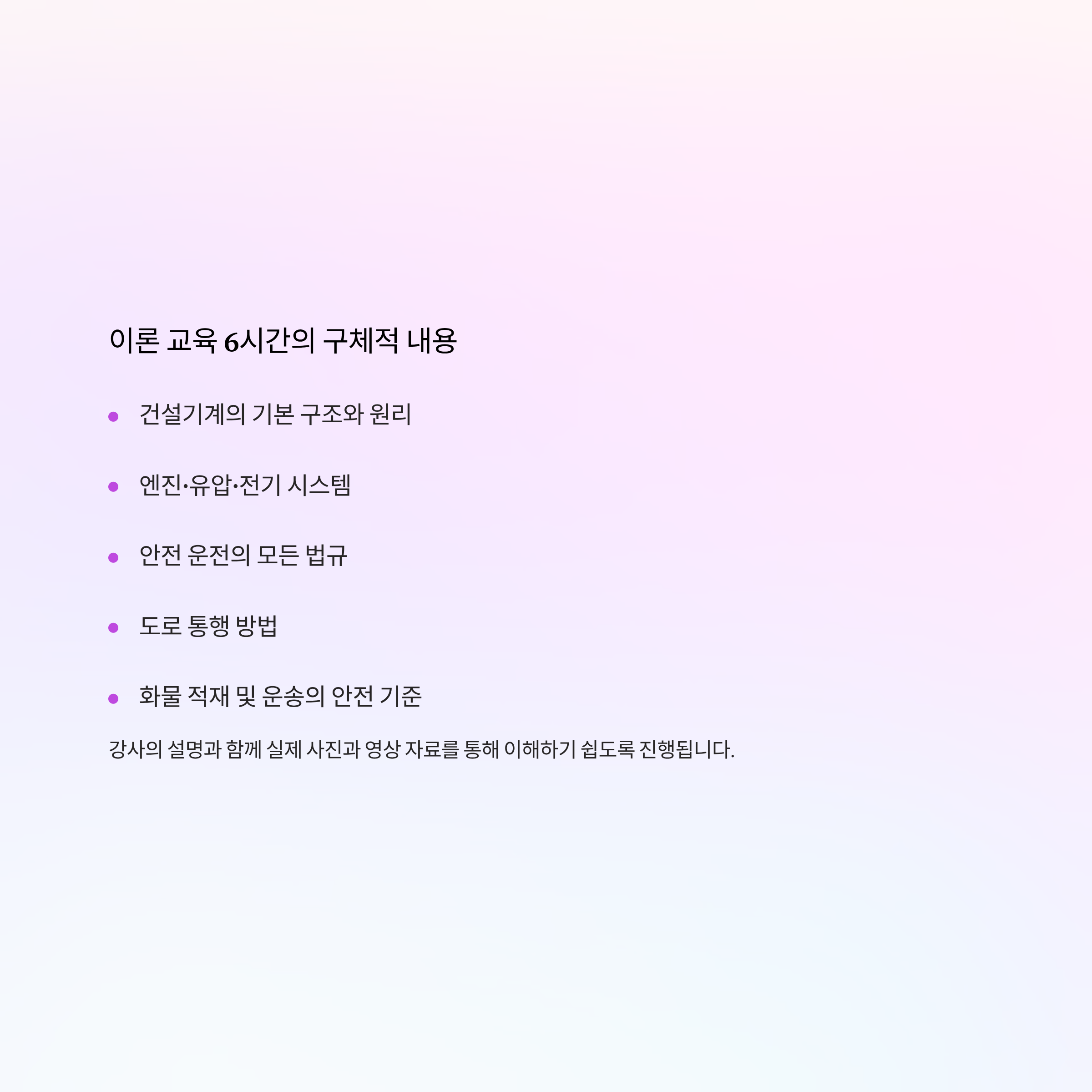 건설기계의 기본 구조와 원리, 엔진·유압·전기 시스템, 안전 운전의 모든 법규, 도로 통행 방법, 화물 적재 및 운송의 안전 기준 등 현장 실무에서 반드시 알아야 할 지식을 습득하게 됩니다.