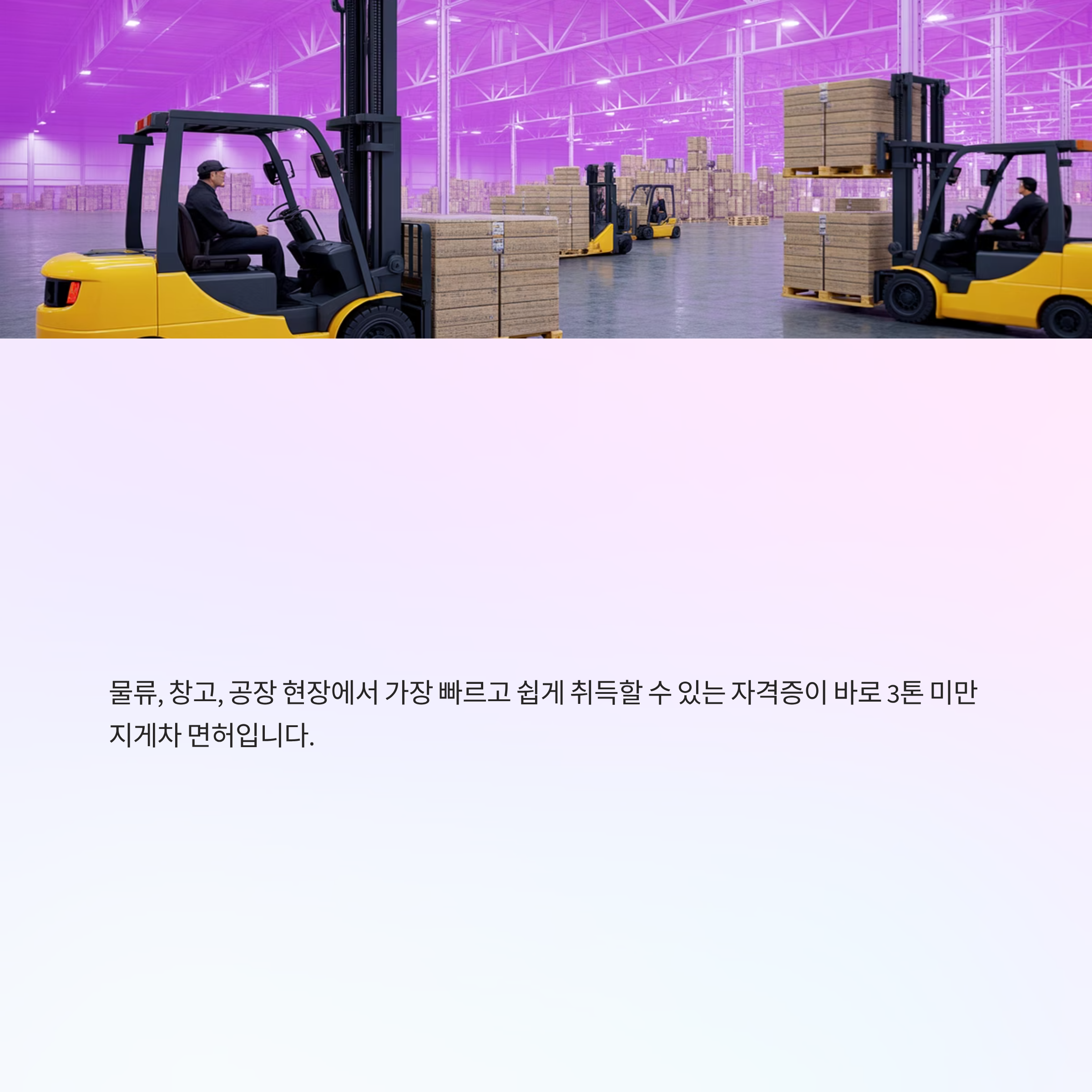 물류, 창고, 공장 현장에서 가장 빠르고 쉽게 취득할 수 있는 자격증이 바로 3톤 미만 지게차 면허입니다.