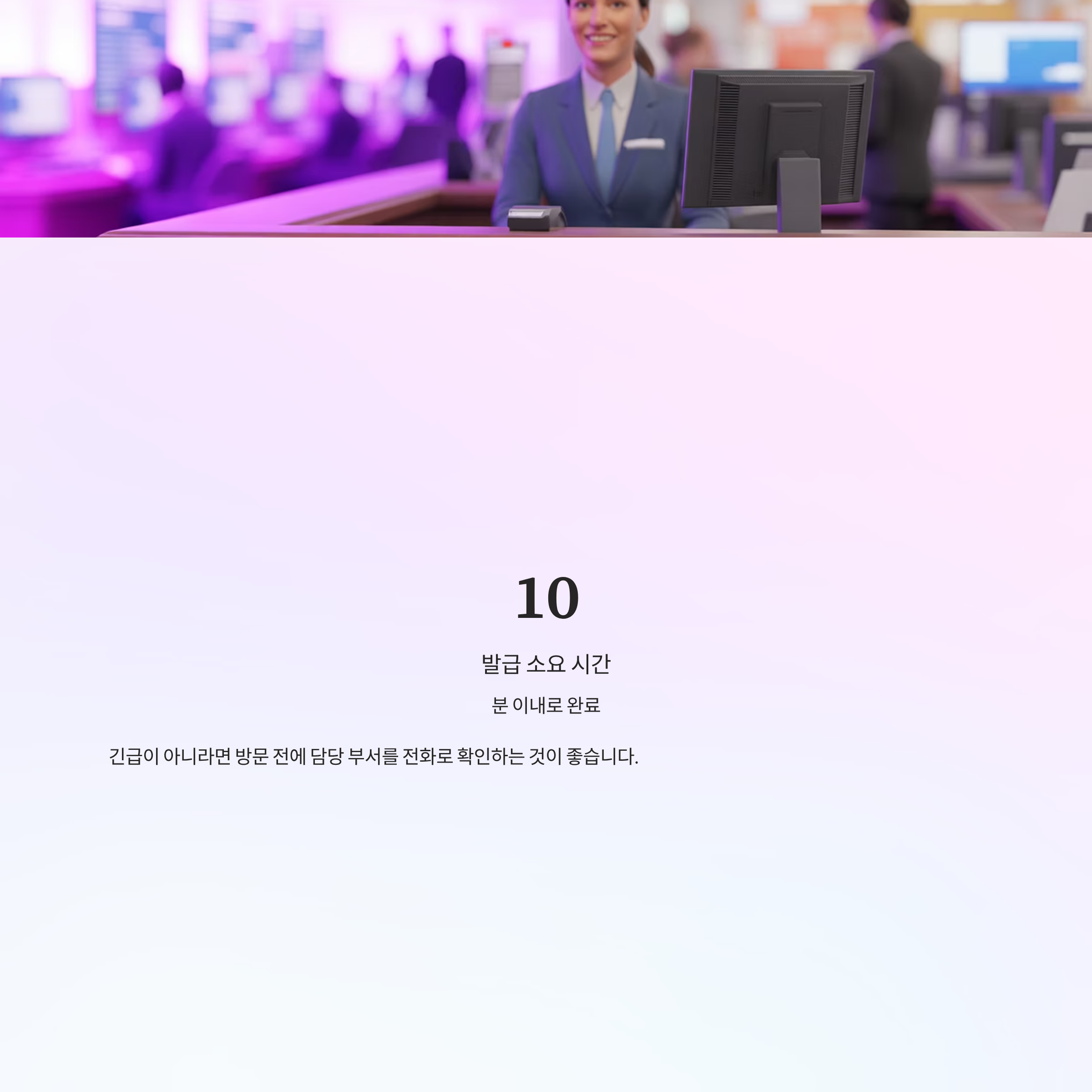 발급은 보통 10분 이내로 완료되며, 긴급이 아니라면 방문 전에 담당 부서를 전화로 확인하는 것이 좋습니다.
