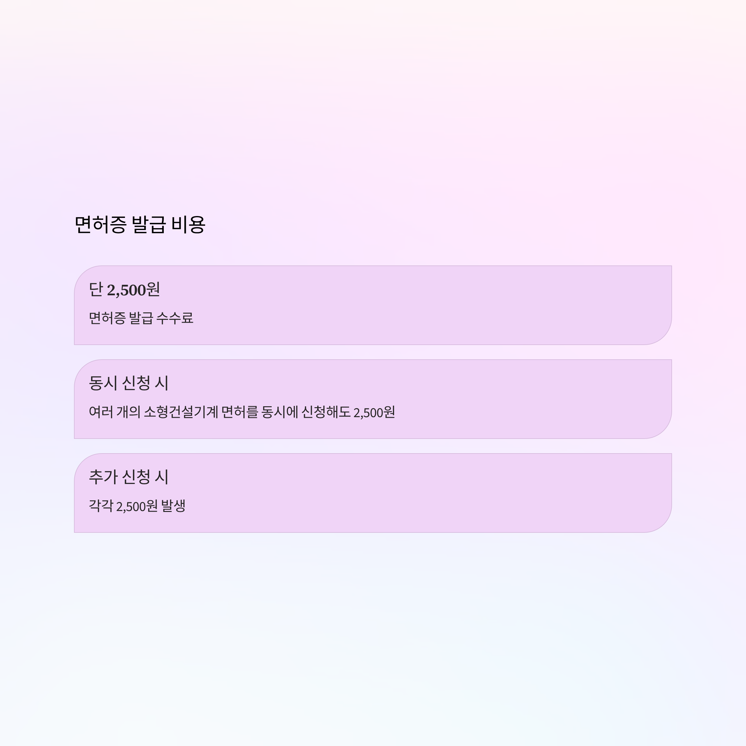 면허증 발급 수수료는 단 2,500원입니다. 여러 개의 소형건설기계 면허를 동시에 신청해도 수수료는 2,500원으로 동일합니다.