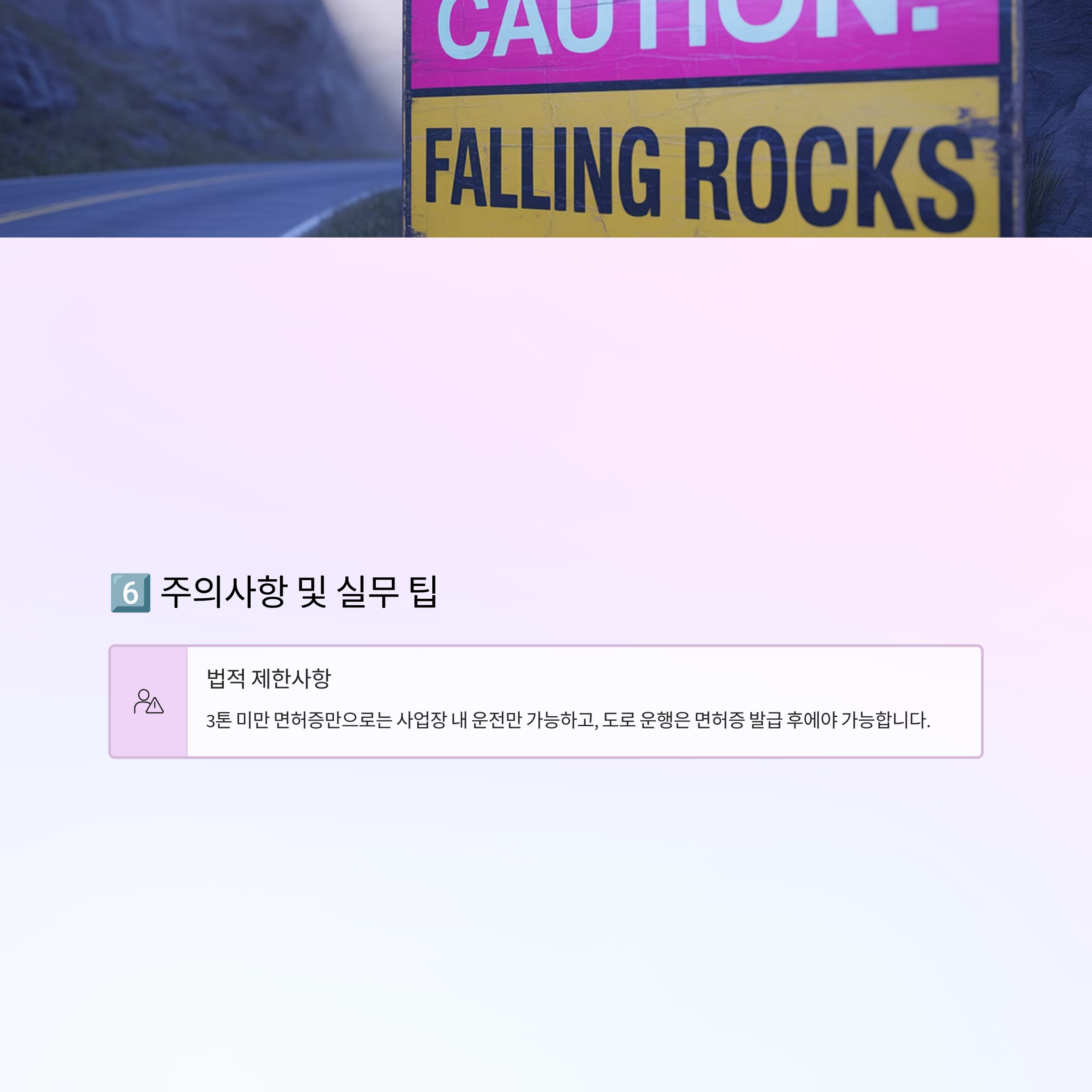 3톤 미만 면허증만으로는 사업장 내 운전만 가능하고, 도로 운행은 면허증 발급 후에야 가능합니다.