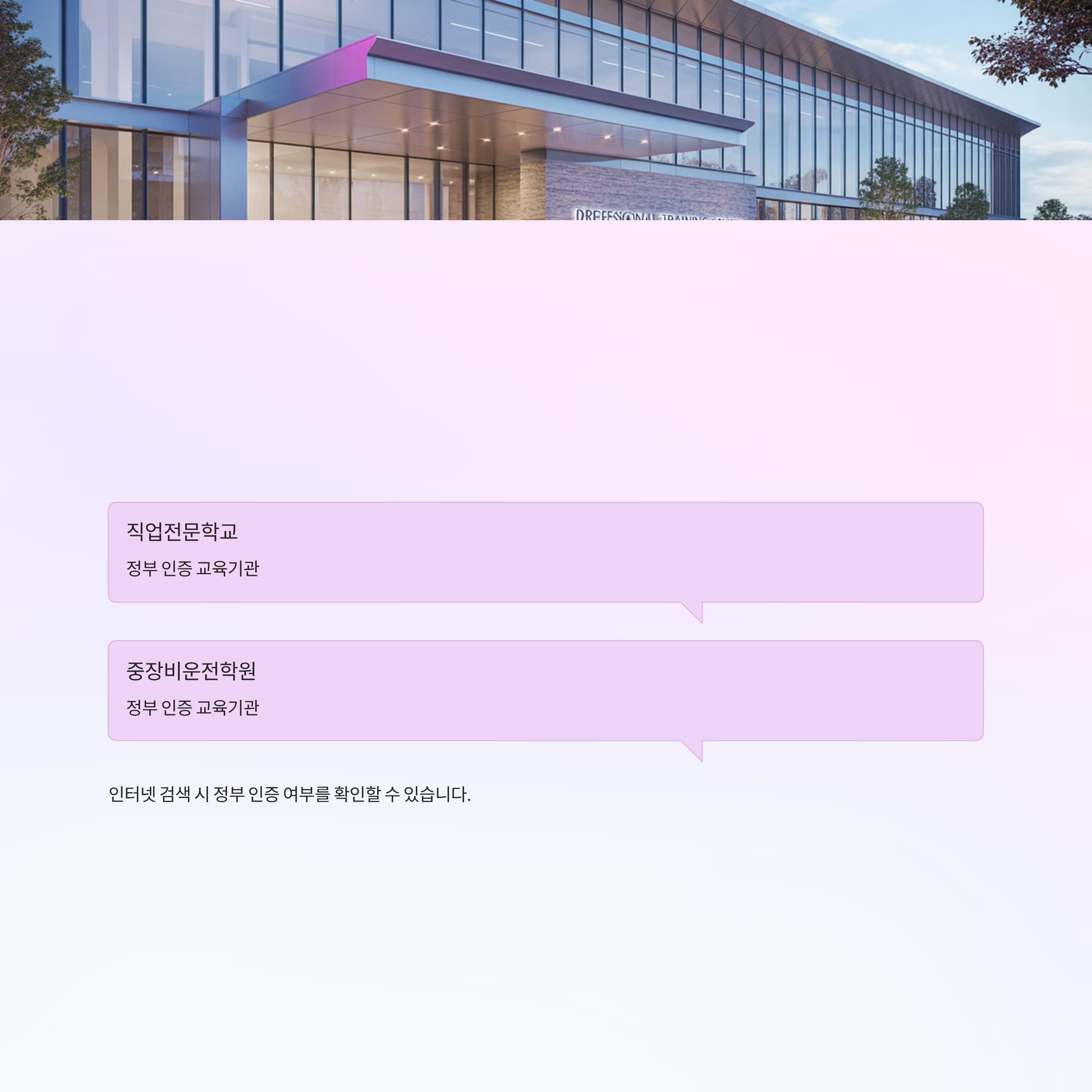 대부분 "직업전문학교" 또는 "중장비운전학원"이라는 이름을 가지고 있으며, 인터넷 검색 시 정부 인증 여부를 확인할 수 있습니다.