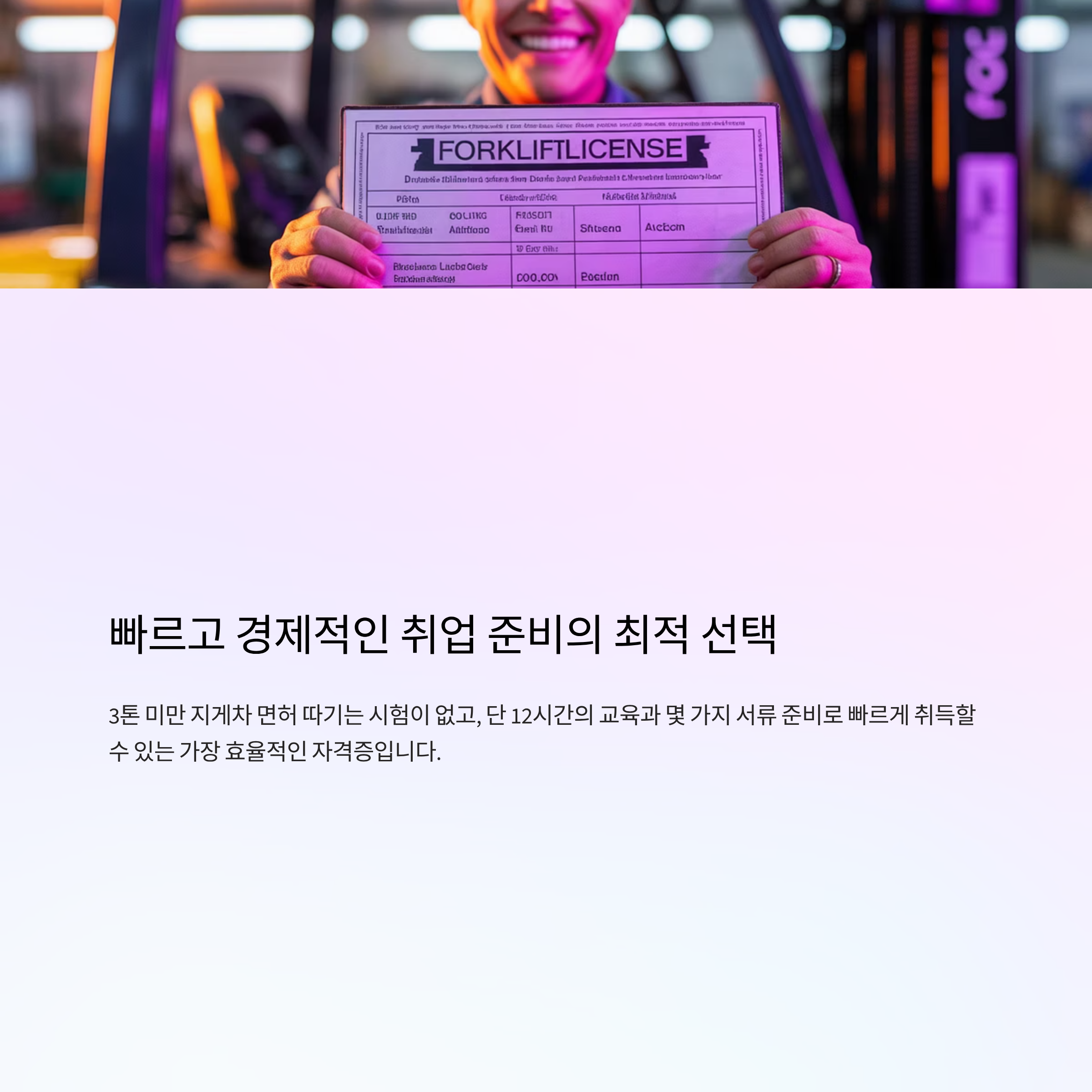 3톤 미만 지게차 면허 따기는 시험이 없고, 단 12시간의 교육과 몇 가지 서류 준비로 빠르게 취득할 수 있는 가장 효율적인 자격증입니다.