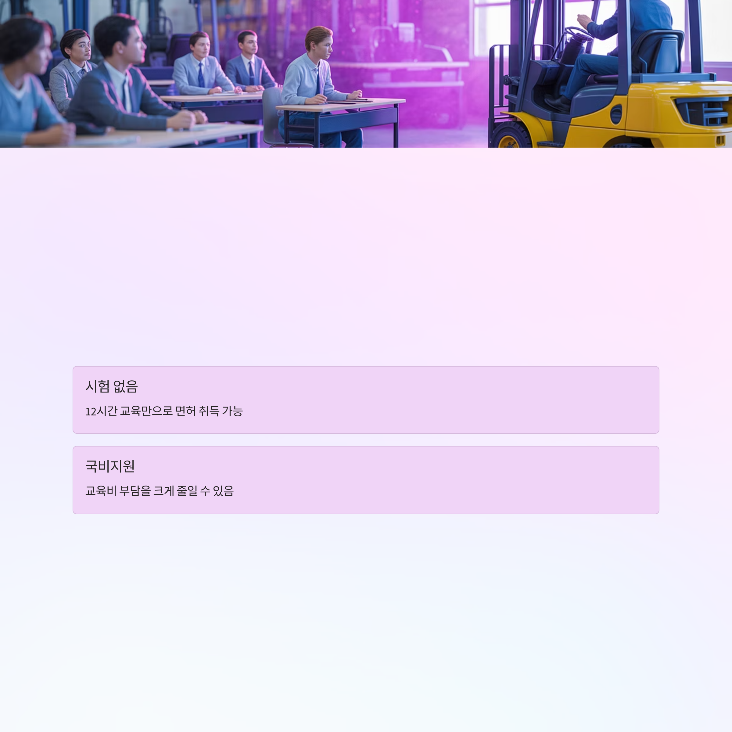 시험이 없고 단 12시간의 교육 이수만으로 면허를 따를 수 있으며, 국비지원을 활용하면 교육비 부담까지 크게 줄일 수 있습니다.