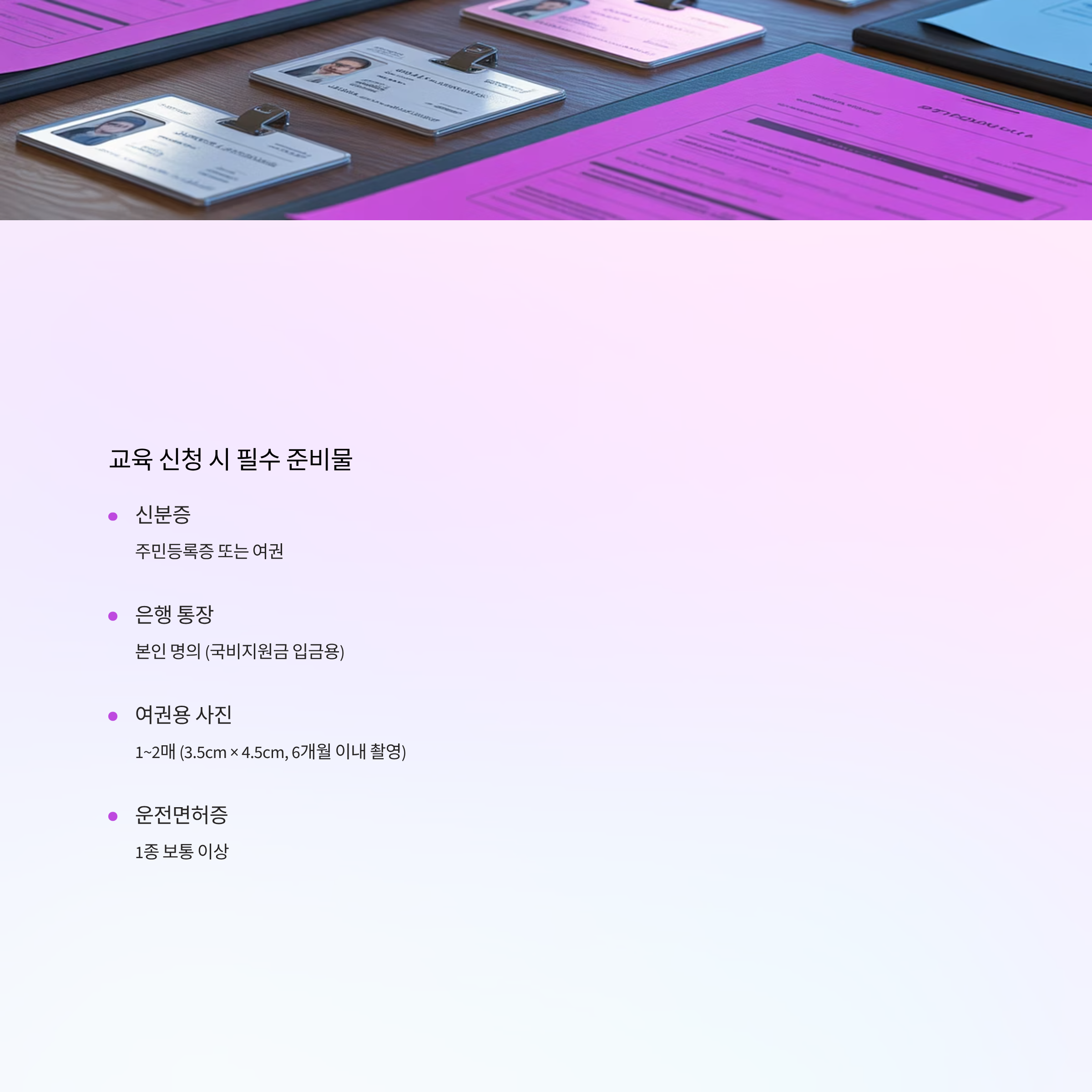 신분증(주민등록증 또는 여권), 본인 명의 은행 통장(국비지원금 입금용), 여권용 사진 1~2매(3.5cm × 4.5cm, 6개월 이내 촬영), 1종 보통 이상 운전면허증이 필요합니다.